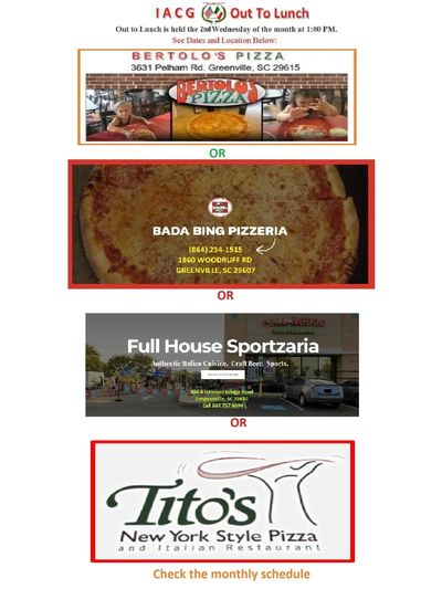 To get together with other members and aspiring members, have lunch together and share our Italian American Heritage and our Italian American experience. (See below for restaurants location)